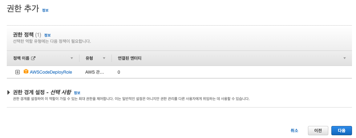 CodeDeploy에 대한 기본 권한이 추가되어 있다. 이 설정 그대로 넘어가자.