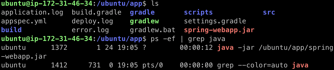 '/ubuntu/app' 경로에 프로젝트가 잘 복사되었다. 이후 'ps -ef | grep java' 명령어를 통해 프로젝트가 인스턴스에 정상적으로 떠있는 것을 볼 수 있다.