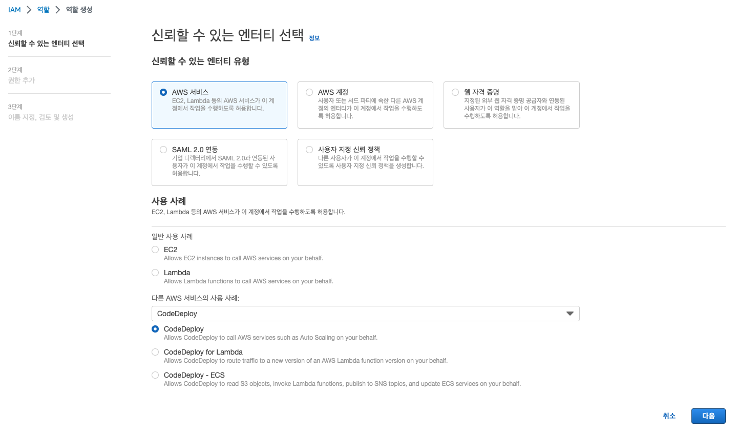 CodeDeploy를 만들기 전 Codedeploy용 IAM 역할을 먼저 만들어야 한다.