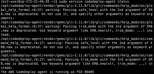 명령어를 모두 따라 하면 다음과 같이 CodeDeploy가 프로세스를 할당받은 것을 확인할 수 있다.