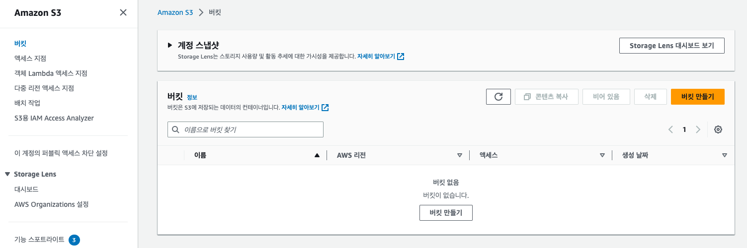 이전까지와 마찬가지로 검색을 통해 S3 메뉴로 접근한 뒤 버킷을 생성한다.