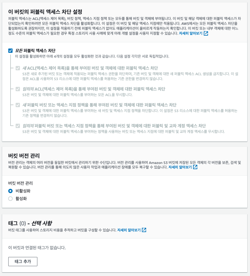 모두 기본값으로 설정한 뒤 버킷을 생성한다.